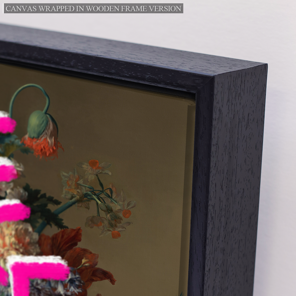 Box Frame Version - The stretched canvas is beautifully concealed inside a plain solid wood box frame, with the canvas sitting 5mm from the wooden edge, creating a lovely floating border. The finished piece sits 1.5" (38mm) deep from the wall. It does not feature the ornate printed fame effect on the canvas.Â